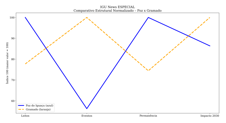 Indicadores normalizados para índice 100, onde o maior valor entre as cidades recebe 100 e o outro é proporcionalmente ajustado. Dados estimativos baseados em informações públicas e projeções econômicas até 2030.