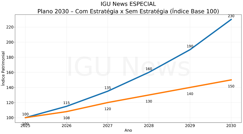 Nota metodológica – As projeções utilizam índice base 100 para simulação comparativa entre cenários com e sem coordenação estratégica. Não constituem recomendação de investimento. Resultados dependem de política pública, ciclo econômico e governança local.