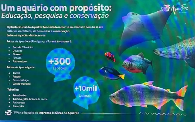 Sobre os habitantes do aquário, os peixes de água doce (Rios Iguaçu e Paraná, além do Amazonas), como os bocudos e surubim, dourado, pintado, pirarucu e raia motoro; Peixes de água salgada serão tainha, robalo, peixe-palhaço, cavalo-marinho; Haverá ainda tubarões, como o raia-prego, raia-chita, tubarão-lixa, tubarão galha-branca de recife.